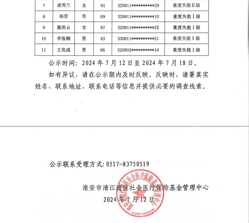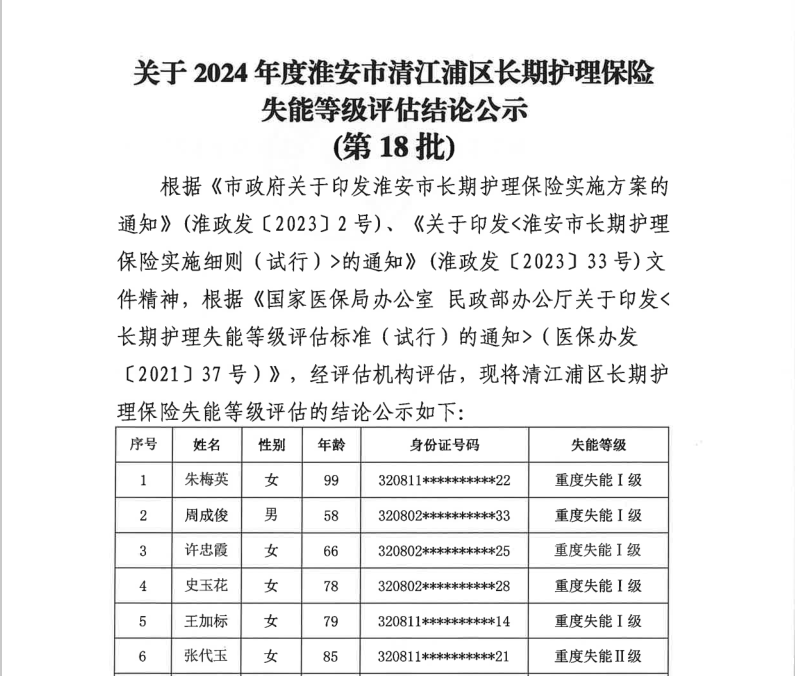 关于2024年度淮安市清江浦区长期护理保险失能等级评估结论公示(第18批)
